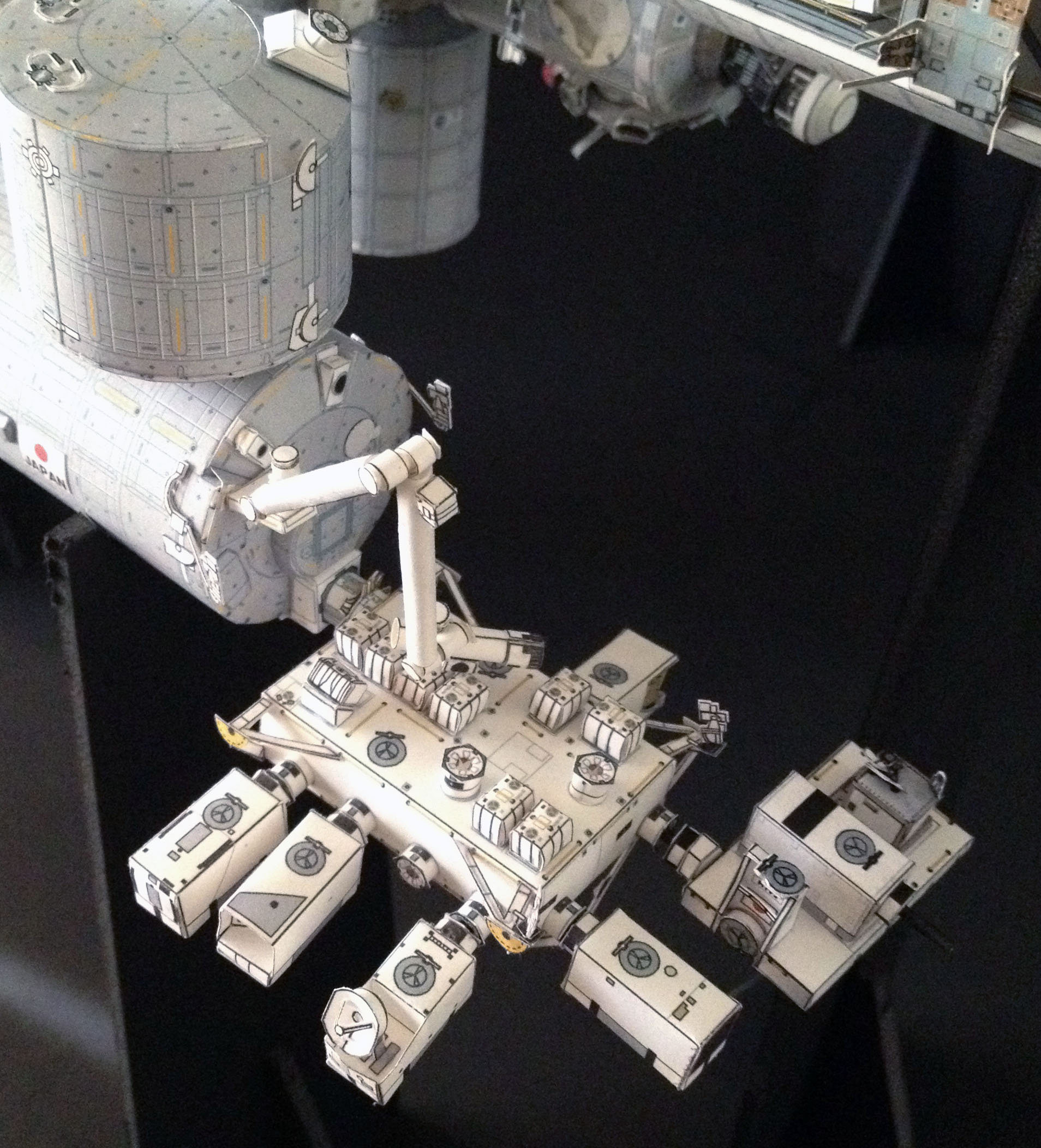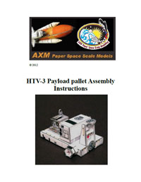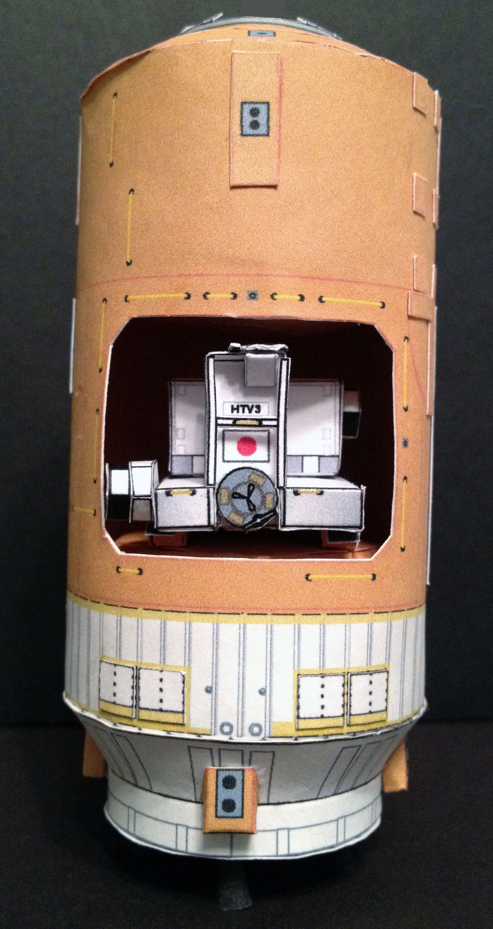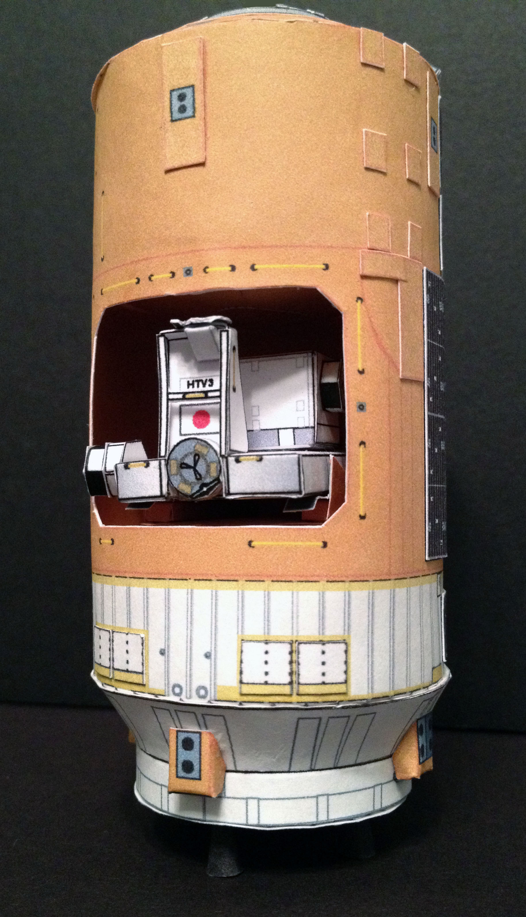 The HTV-3 was successfully launched to the International Space Station on July 21, 2012 from the Yoshinobu Launch Complex in Tanegashima, Japan. This is JAXA's (Japan Aerospace Exploration Agency) third unmanned space vehicle for International Space Station (ISS) re-supply and waste cargo disposal. HTV-1 and HTV-2 were successfully launched in 2009 and 2011 respectively. For this mission, the HTV-3 will carry the following payloads: -SCaN Testbed payload ( will be mounted on the ELC-3 pallet) -MCE payload ( will be mounted on the Japanese KIBO Exposed Facility pallet) The HTV-3 papermodel was made possible from sources obtained from JAXA website and NASA's Glenn Research Center. Special thanks to Dan Catalano from GRC for approaching me and my site for the production of the 1:10 scale version of the SCAN Testbed payload. The 1:10 scale paper model is available at NASA's GRC website for free download. The assembly manual of the HTV-3 "Kounotori3" can be downloaded from page HTV-1.