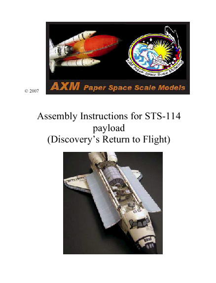 STS-114 Payload (Discovery's "Return to Flight") / ULF-1 Space Shuttle Discovery STS-114 was the "Return to Flight" mission after Columbia's last flight. It was launched on July 26, 2005 on a mission to the International Space Station. It was a "test flight" to verify modifications made during the stand-down after the Columbia accident. This mission carried the "Raffaello" Multipurpose Logistic Module as the primary payload and supplies to the ISS, a new control moment gyro (CMG), the External Stowage Platform-2 and test tile and RCC (Reinforced carbon-carbon) repair techniques on orbit (DTO-848). This was the first time that an extension to the Robotic arm was carried on the Shuttle. It was the OBSS (Orbiter Boom Sensor System) that allowed Discovery to be checked for damage while on orbit. For this flight the ET was "re-designed" by eliminating the bipod foams. But unfortunately immediately after lift-off, Discovery's new cameras on board and on the ET detected foam shedding from the external tank. NASA decided then to ground the shuttle fleet. Discovery finally landed on August 9, 2005 at Edwards Air Force Base. For this model, the payload detail was made possible thanks to NASA's photo Gallery and Dennis Jenkins / Jorge Frank "Return to Flight - Space Shuttle Discovery" photo scrapbook. Excellent resources. All the payload elements can be removed easily in order to make the different configurations for photo shooting. The "Raffaello" module can be removed and also can be attached to International Space Station Node 1 "Unity". Also, the External Stowage Platform-2 can be modified and attached to International Space Station "Quest" module as well. On this mission, during the first EVA, the MISSE-1 and MISSE-2 experiments from STS-105 were retrieved. A new experiment, the MISSE-5 experiment was onboard Discovery and was attached to the P6 truss. This experiment eventually was retrieved on STS-115 mission. Photo below shows the location of the MISSE-5. The file for the MISSE-5 experiment is available on the STS-105 payload page. UPDATE!! This file has been revised. The "Raffaello" module has been re-colored to match the current ISS elements. Also, one of the ORU's, the Flex Hose Rotary Coupler (FHRC) has been re-designed and is more accurate. As a bonus, there is an 1:100 scale version of the ESP-2 available on this page, too! Check the updated assembly manual for this payload, too. 3/14/09 Update: When reviewing NASA photos it was noticed that the Grapple Fixtures for the OBSS were modified since the first time the OBSS was used on mission STS-114. Download the OBSS file with the modified Grapple Fixtures. All STS missions beginning with STS-114 will use these modified Grapple Fixtures for the OBSS boom. Enjoy this model!