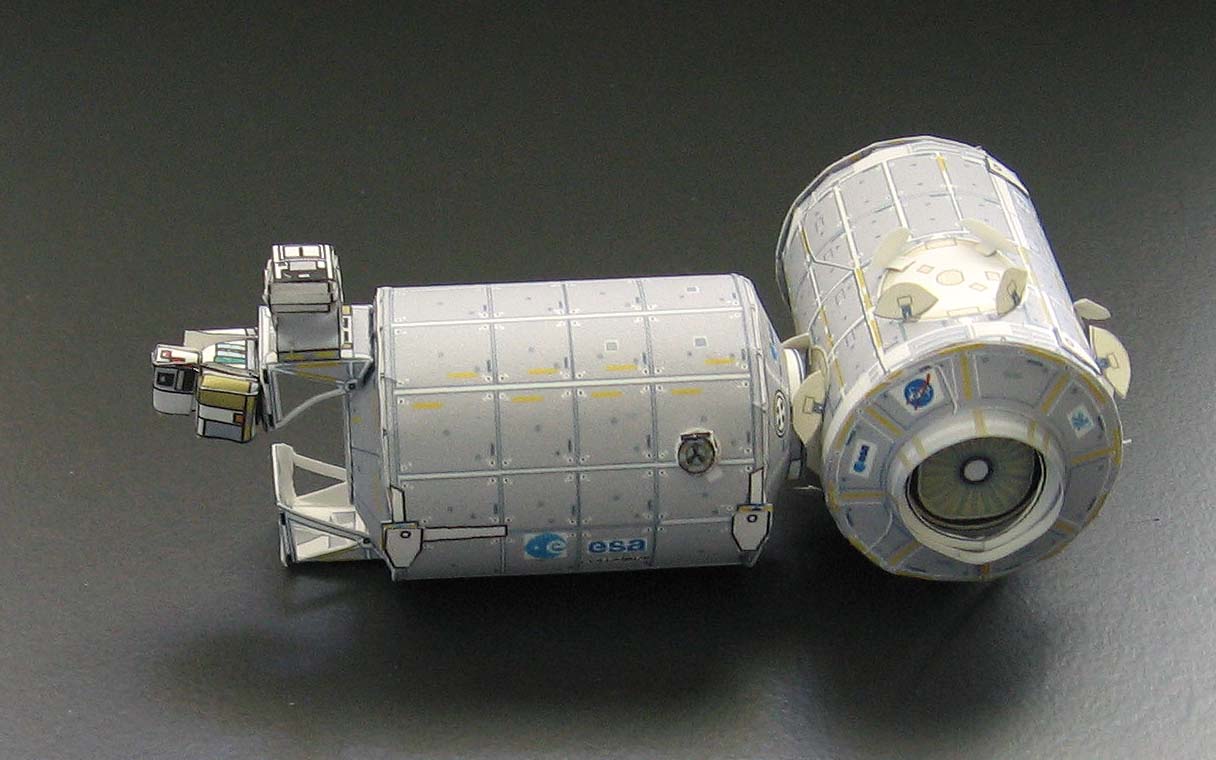 STS-122 Payload "Columbus" Space Shuttle Atlantis was launched to the ISS on Feb 7, 2008 carrying the long awaited "Columbus" European Research Module on mission 1E in the assembly sequence. Two European astronauts were onboard, Leopold Eyharts from France and Hans Schlegel from Germany. Eyharts was the new ISS-16 crewmember replacing Dan Tani. Atlantis docked for the first time to the new installed Node 2 module which was delivered via STS-120 mission. This mission brought a new Space Station configuration with the addition of Columbus to the starboard port of Node 2. This papermodel is available via Paypal only. The details that helped design this model was obtained from NASA site and technical data from Robotics documentation. The ESP-2 configuration for this mission has been added to this page and is available for download in both 1:144 and 1:100 scales. Enjoy this model!